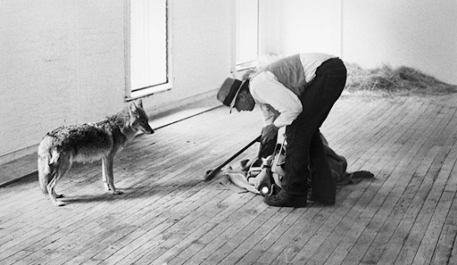 Joseph Beuys, dans sa performance de 1974, "I Like America and America Likes Me", se confine pendant trois jours avec un coyote dans une galerie d'art new-yorkaise